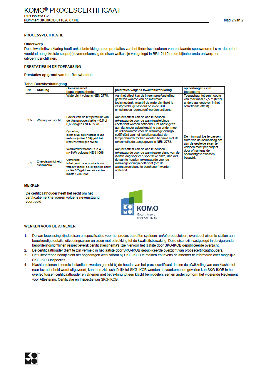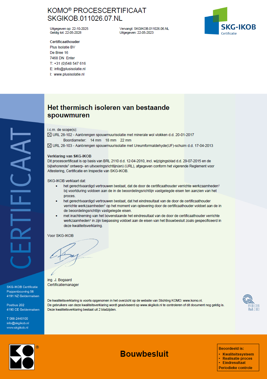 Deze instantie controleert de kwaliteit van de producten en voert onaangekondigde controles uit tijdens de spouwmuur isolatiewerkzaamheden. Plus Isolatie meld al haar isolatieklussen aan bij deze instantie, zodat de controleurs weten waar onze isolatieploegen de spouwmuurisolatieklussen aan het uitvoeren zijn.