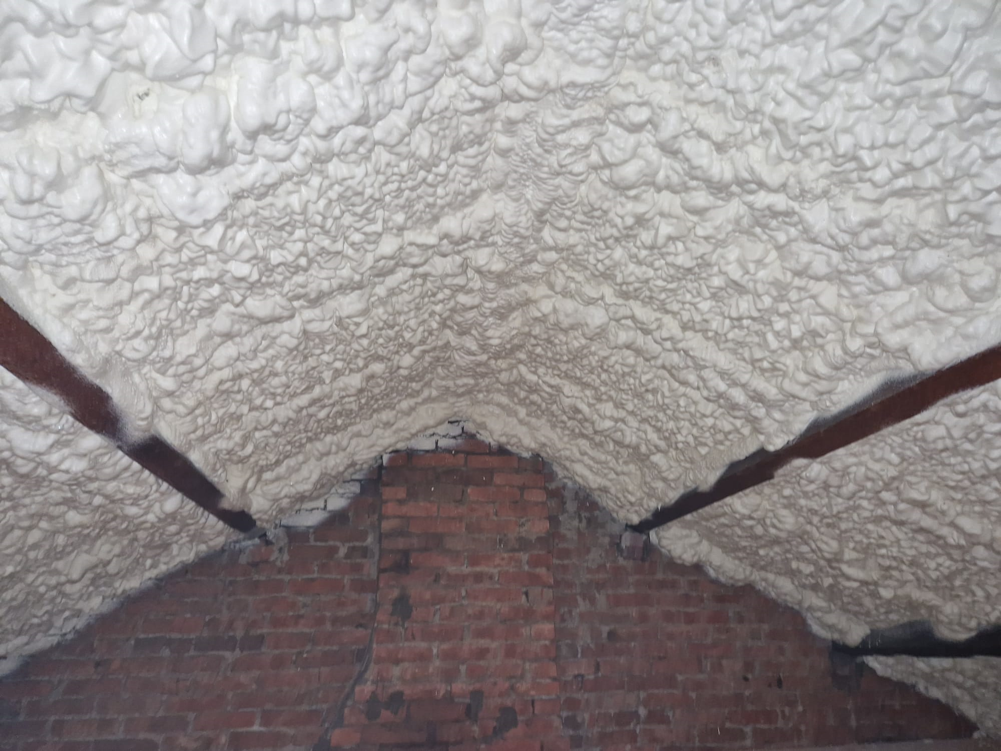 Roof insulation using Icynene PUR foam: This insulation material is applied with a spray gun. The application takes place on the inside of the roof. The PUR foam hardens within seconds after it has been applied with a spray gun. Since the foam is initially liquid, it easily penetrates into all cavities, joints, and crevices.