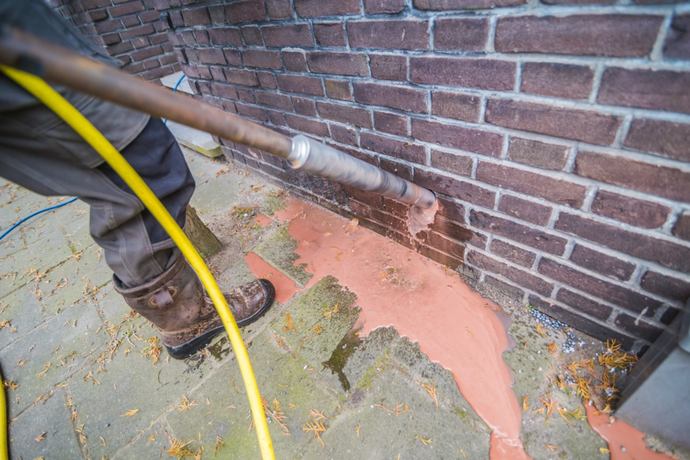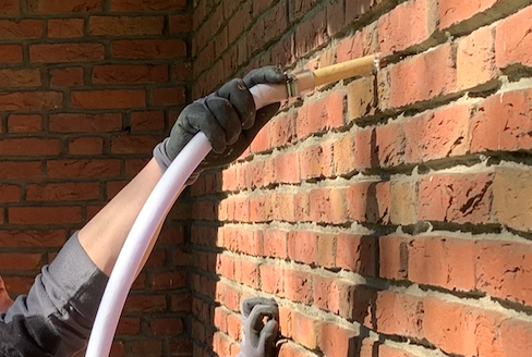 het aanbrengen van spouwmuurisolatie in een bestaande spouwmuur.