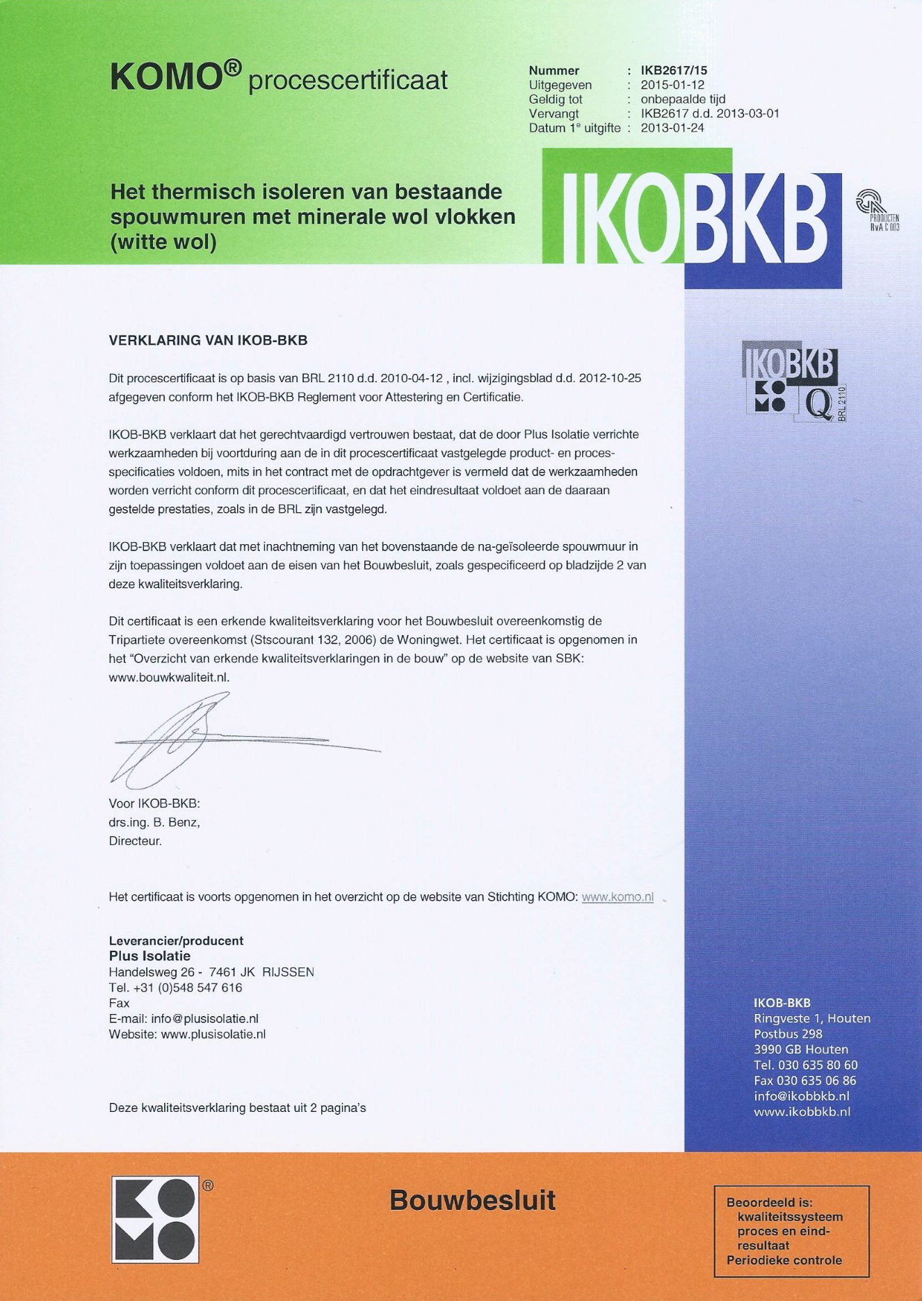 Plus Isolatie is een KOMO gecertificeerd isolatiebedrijf voor het aanbrengen van spouwmuurisolatie. Omdat wij een KOMO gecertificeerd isolatiebedrijf zijn, werken wij volgens de uitvoeringsrichtlijnen van het SKG-IKOB. Tijdens isolatiewerkzaamheden worden wij hierop ook steekproefsgewijs gecontroleerd door onafhankelijke externe inspecteurs van het SKG-IKOB.
